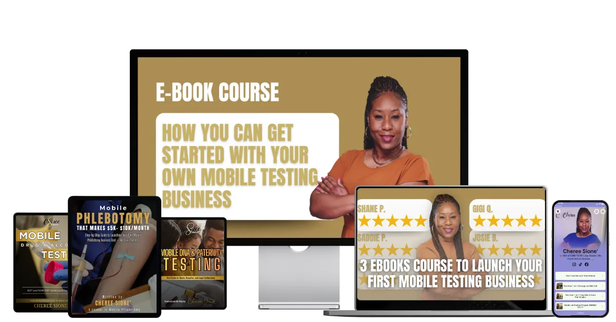 Step confidently into the growing field of mobile phlebotomy, drug and alcohol testing, and DNA/paternity services. This comprehensive 3-in-1 ebook bundle gives you the exact knowledge, systems, and best practices you need to launch, manage, and scale a thriving mobile testing business.